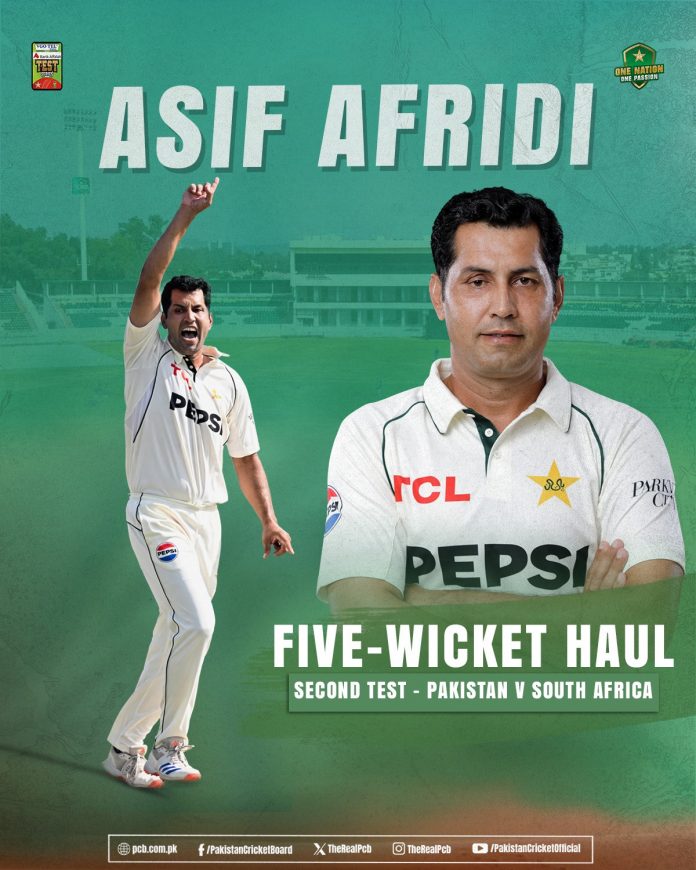 اہلیہ نے کافی حوصلہ بڑھایا ہے کہ بیٹی ٹھیک ہے، اللہ کرے ہم میچ جیت جائیں، اگر ایسا ہوا تو میچ اپنی بیٹی کےنام کروں گا۔ آصف آفریدی نے مزید کہا کہ مجھے خواہش تھی کہ میری بیٹی ہو، تاہم بیٹی ہوئی اور وہ اسپیشل چائلڈ ہے، بیٹوں کے مقابلے میں بیٹی سے زیادہ پیار کرتا ہوں۔ واضح رہے کہ راولپنڈی ٹیسٹ کی پہلی اننگز میں پاکستان نے 333 رنز بنائے، کپتان شان مسعود نے شاندار 87 رنز کی اننگز کھیلی، سعود شکیل 66 اور عبداللہ شفیق 57 رنز بنا کر نمایاں رہے۔ پروٹیز باؤلر کیشو مہاراج نے 102 رنز کے عوض عمدہ باؤلنگ کا مظاہرہ کرتےہوئے 7 کھلاڑیوں کو پویلین کی راہ دکھائی۔ پاکستان کی پہلی اننگز کے جواب میں جنوبی افریقی ٹیم 404 رنز بنا کر آؤٹ ہوئی، 235 رنز پر 8 کھلاڑیوں کے آؤٹ ہونے کے بعد جب پاکستان کی اچھی سبقت کی امید لگائی جا رہی تھی۔ وہیں سینوران متھوسوامے نے عمدہ بلے بازی کا مظاہرہ کرتے ہوئے 89 رنز کی ناٹ آؤٹ اننگز کھیلی، جب کہ کگیسو ربادا نے بھی 71 رنز بنا کر پاکستان کے خلاف 71 رنز کی لیڈ حاصل کرنے میں بھرپور ساتھ دیا۔ پاکستان کی جانب سے ڈیبیو کرنے والے 38 سالہ لیفٹ آرم اسپنر آصف آفریدی نے 6 کھلاڑیوں کو آؤٹ کیا، نعمان علی نے 2، ساجد خان اور شاہین شاہ آفریدی کے حصے میں ایک، ایک وکٹ آئی۔ راولپنڈی ٹیسٹ میں تیسرے دن کے کھیل کے اختتام پر پاکستان نے 4 وکٹوں کے نقصان پر 94 رنز بنا لیے ہیں، گرین شرٹس کو پروٹیز کیخلاف 23 رنز کی معمولی برتری حاصل ہو گئی، ٹاپ آرڈر بیٹر بابر اعظم 49 رنز بنا کر جب کہ محمد رضوان 16 رنز کے ساتھ وکٹ پر موجود ہیں
