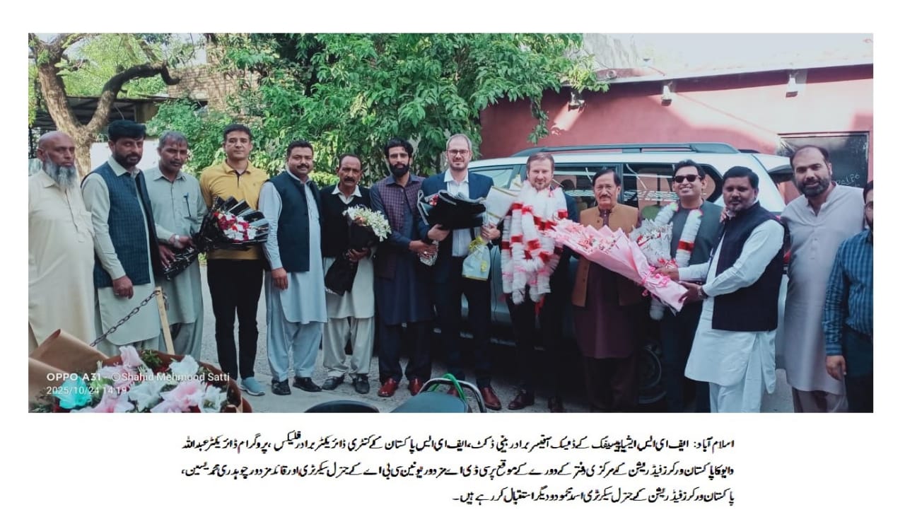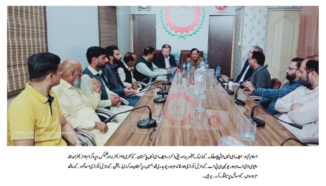 ایف ای ایس ایشیا پیسیفک کے ڈیسک آفیسر برادر بینی ڈکٹ، ایف ای ایس پاکستان کے کنٹری ڈائریکٹر برادر فلیکس، پروگرام ڈائریکٹر عبداللہ دایو نے پاکستان ورکرز فیڈریشن کے مرکزی دفتر کا دورہ کیا۔ اس موقع پر انھوں نے سی ڈی اے مزدور یونین سی بی اے کے جنرل سیکرٹری اور قائد مزدور چوہدری محمد یسین، پاکستان ورکرز فیڈریشن کے جنرل سیکرٹری اسد محمود، چوہدری اسد الرحمن عاصی، واجد گجر، سلیم بھٹی، محمد سرفراز ملک، چوہدری بلال، ارشاد بی بی، چوہدری اظہر لطیف، زاہد کاٹھیا، شاہد ستی، گوہرالہی، حاجی جنید، فاروق نور سمیت عہدیداران سے خصوسی ملاقات کی۔ اس موقع پر قائد مزدور چوہدری محمد یسین نے وفد کو خوش آمدید کرتے ہوئے کہا کہ پاکستان ورکرز فیڈریشن اور ایف ای ایس کے دیرینہ تعلقات ہیں اور دونوں تنظیمیں پاکستان کے مزدوروں کی فلاح و بہبود اور بہتری کے لیے مل کر کام کر رہے ہیں جس کے مزدوروں پر مثبت اثرات مرتب ہوئے ہیں۔