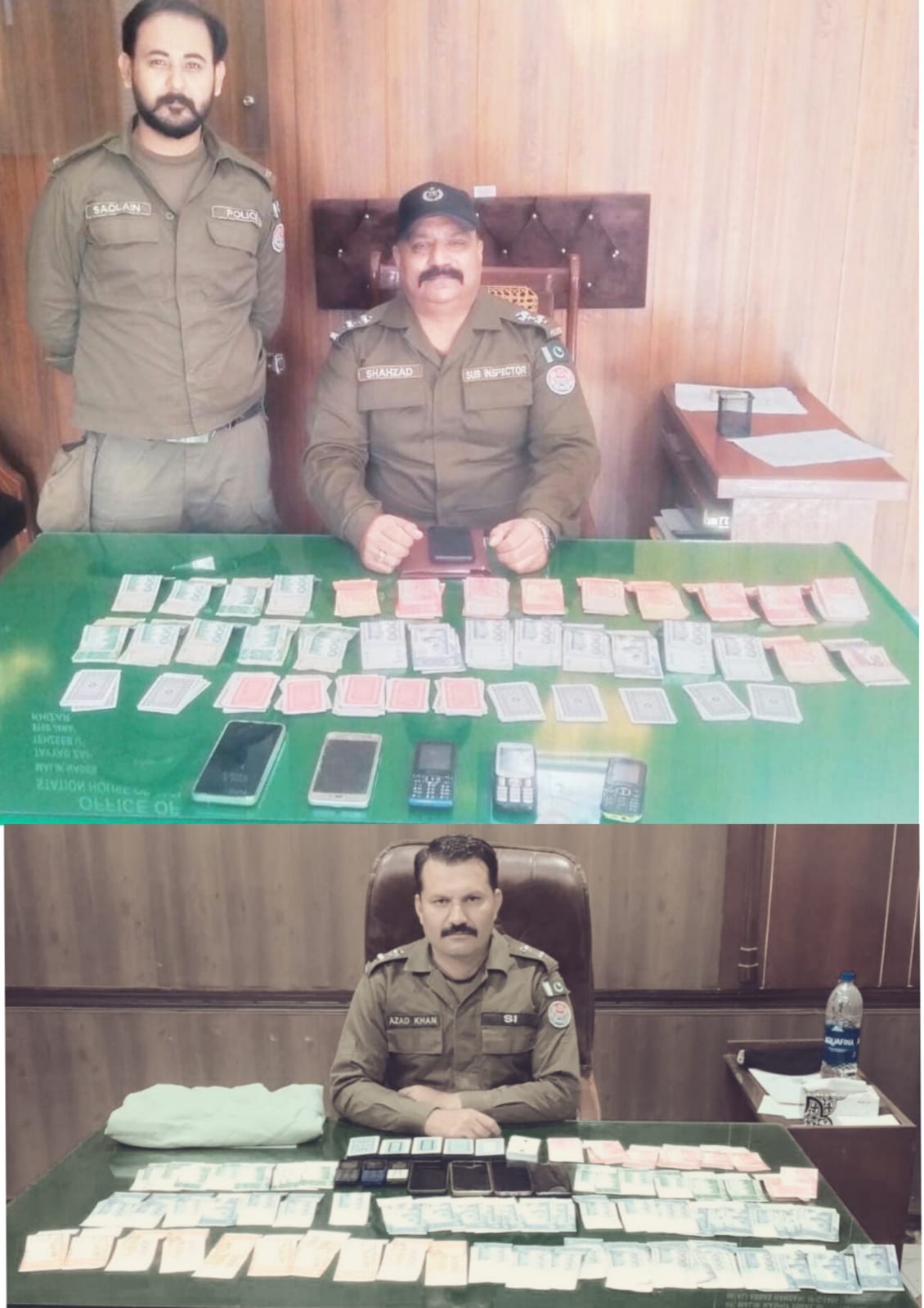 راولپنڈی(ٹی این ایس)تھانہ وارث خان تھانہ پیرودھائی پولیس کی الگ الگ کاروائیاں 19 جواری رنگے ہاتھوں گرفتار ۔ تاش کے پتوں پر جواء کھیلنے والے افراد سے داؤ پر لگی رقم 1 لاکھ 42 ہزار 500 روپے، 12 موبائل فون اور تاش کے پتے برآمد۔تفصیلات کے مطابق پیرودھائی پولیس نے کارروائی کرتے ہوئے 11 افراد کو حراست میں لیکر داؤ پر لگی رقم 1 لاکھ 22 ہزار 500 روپے، 7 موبائل فون اور تاش کے پتے برآمد کیے، جبکہ وارث خان پولیس سب انسپکٹر شہزاد شاہ نے ہمراہ ٹیم کارروائی کرتے ہوئے 8 افراد کو حراست میں لیکر داؤ پر لگی رقم 20 ہزار روپے،8 موبائل فون اور تاش کے پتے برآمد کیے،قمار بازی دیگر معاشرتی برائیوں کی جڑ ہے ملوث افراد قانون کی گرفت سے نہیں بچ سکتے۔