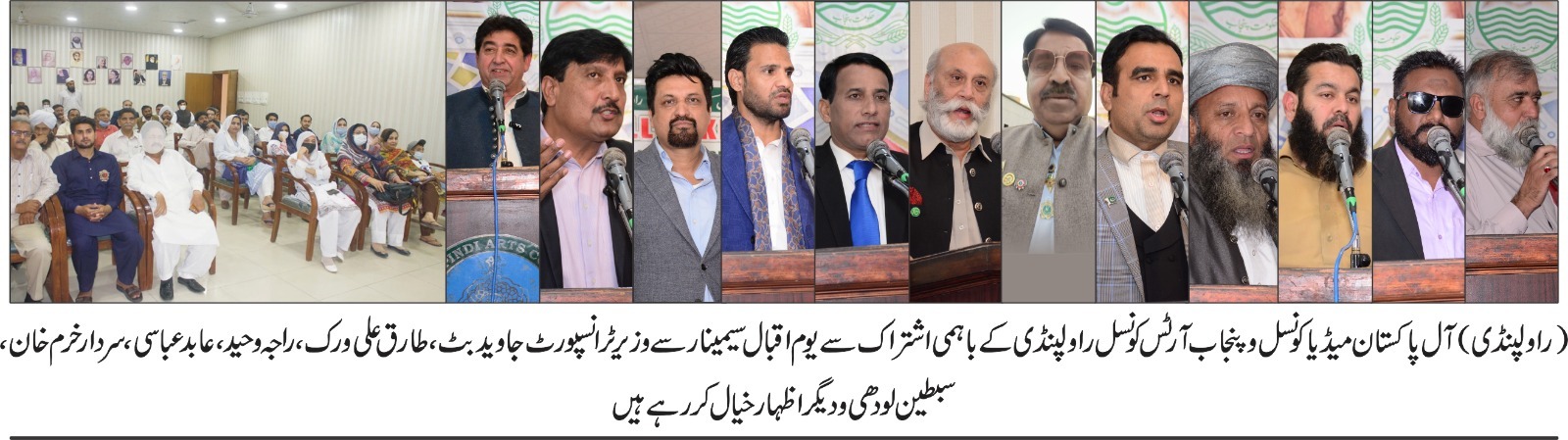 یومِ اقبال سیمینار 2025 آج راولپنڈی آرٹس کونسل میں ایک پُروقار اور فکری انداز میں منعقد ہوا۔ تقریب میں مہمان خصوصی وزیر ٹرانسپورٹ آزاد کشمیر جاوید بٹ ، صدر راولپنڈی اسلام آباد یونین آف جرنلسٹ طارق علی ورک ، عابد عباسی ، صدر اے پی ایم سی سردار خرم خان ، سماجی شخصیت سبطین رضا لودھی ، خالد آفتاب سلہری پریزیڈنٹ آئی ایچ آر او ، چئیرمن نیشنل پیس کونسل آف پاکستان محمد وحید راجہ ، چئیرمن ایم وائے ویلنئٹر یسین سیفی ، سینئر اینکر پرسن قانون دان طارق راجپوت جرال ، صدر کیپیٹل جرنلسٹ ایسوسی ایشن وقار حیدر چوہان ، ملک عمران خان اعوان ، وائس چیئرمین نیو پاکستان ذندہ باد موومنٹ چوہدری غضنفر و دیگر قومی و سماجی شخصیات، ممتاز صحافیوں، دانشوروں، اور نوجوان رہنماؤں نے شرکت کی۔