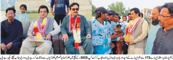 رحیم یارخان:حلقہ این اے172 سے ایم این اے کے امیدوار چوہدری عادل باجوہ پنجاب کرکٹ کپ2025ء کے میچ میں بطورمہمان خصوصی کھلاڑیوں سے ملاقات جبکہ دوسری جانب میچ دیکھ رہے ہیں