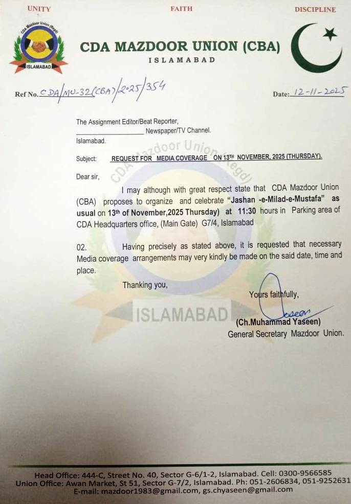 اسلام آباد (ٹی این ایس) سی ڈ ی اے مزدور یونین(سی بی اے)چوہدری محمد یٰسین گروپ کے زیر اہتمام سالانہ تاجدارختم نبوتؐ کانفرنس ومحفل میلاد مورخہ13نومبربروزجمعرات بوقت دن 10بجے چیئرمین آفس کمپلیکس جی-7/4میں منعقد ہو گی جس کی صدارت صاحبزادہ حق خطیب حسین علی بادشاہ سرکار بلاوڑہ شریف کریں گے،کانفرنس میں معروف مذہبی وسماجی شخصیت الحاج محمدنوازگوندل،پاکستان سویٹ ہومز کے سرپرست اعلیٰ زمردخان،پیرعبید احمد عبید،علامہ مولانا عبدالغنی نقشبندی،چیئرمین اثناء عشریہ ٹرسٹ مرکزی امام بارگاہ ملک امجد حسین علوی،سابق ڈپٹی میئراعظم خان سمیت علمائے کرام،سیاسی وسماجی رہنماء،معززین علاقہ اور اسلام آباد کے شہریوں سمیت سی ڈی اے ملازمین کثیرتعدادمیں شرکت کریں گے،پروگرام کے اختتام پر صاحبزادہ حق خطیب حسین علی بادشاہ سرکارسجادہ نشین بلاوڑہ شریف دعاکروائیں گے اور خصوصی دم کریں گے،بارش کی صورت میں پروگرام فائر بریگیڈ ہال سیکٹرG-7/1میں منعقد ہو گا۔