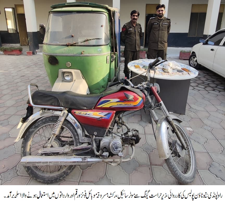 راولپنڈی (ٹی این ایس) ایس ایچ او نیوٹاؤن لقمان پاشا کی سربراهی میں پولیس ٹیم کی کارروائی، سٹریٹ کرائم و موٹر سائیکل چوری کے مقدمات میں ملوث 2 رکنی گینگ گرفتار، 1موٹر سائیکل،1 رکشہ، 06 مسروقہ موبائل فونز، مسروقہ رقم 1 لاکھ 85 ہزار روپے برآمد، گینگ سے وارداتوں میں استعمال ہونے والا اسلحہ بھی برآمد۔ تفصیلات کے مطابق نیوٹاؤن پولیس نے کارروائی کرتے ہوئے سٹریٹ کرائم و موٹر سائیکل چوری کے مقدمات میں ملوث 2 رکنی گینگ کو گرفتار کر لیا، زیر حراست گینگ سے 1موٹر سائیکل،1 رکشہ، 06 مسروقہ موبائل فونز، مسروقہ رقم 1 لاکھ 85 ہزار روپے برآمد ہوئی، گینگ سے وارداتوں میں استعمال ہونے والا اسلحہ بھی برآمد ہوا، نیوٹاؤن پولیس نے ٹیکنیکل و ہیومن انٹیلی جنس ذرائع بروئے کار لاتے ہوئے گینگ کو ٹریس کرکے گرفتار کیا، ایس پی راول سعد ارشد کا کہنا تھا کہ زیرحراست افراد کو ٹھوس شواہد کے ساتھ چالان عدالت کیا جائے گا، شہریوں کو انکے قیمتی اثاثہ سے محروم کرنے والے افراد قانون کی گرفت سے نہیں بچ سکتے۔