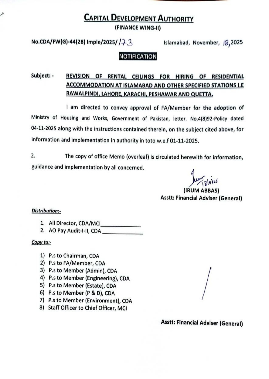 اسلام آباد (ٹی این ایس) منسٹری ہاؤسنگ اینڈ ورکس کی طرف سے جاری کردہ لیٹرنمبر4(8)92-پالیسی 04-11-2025 کے تحت اور سی ڈی اے مزدور یونین کی ڈیمانڈپر سی ڈی اے نے ادارے میں کام کرنے والے تمام ملازمین کے ہاؤس رینٹ سیلنگ میں 85 فی صد اضافے کی منظوری دے دی جس کا باقاعدہ نوٹیفکیشن جاری کر دیا گیا۔ نوٹیفکیشن کے مطابق یہ اضافہ یکم نومبر 2025 سے نافذ العمل ہوگا۔