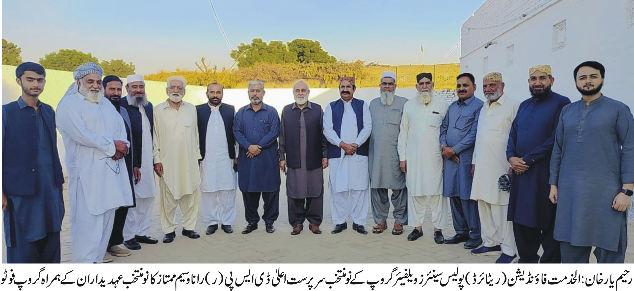 رحیم یارخان:الخدمت فاؤنڈیشن (ریٹائرڈ) پولیس سینئرزویلفیئرگروپ کے نومنتخب سرپرست اعلیٰ ڈی ایس پی (ر) رانا وسیم ممتازکانومنتخب عہدیداران کے ہمراہ گروپ فوٹو۔