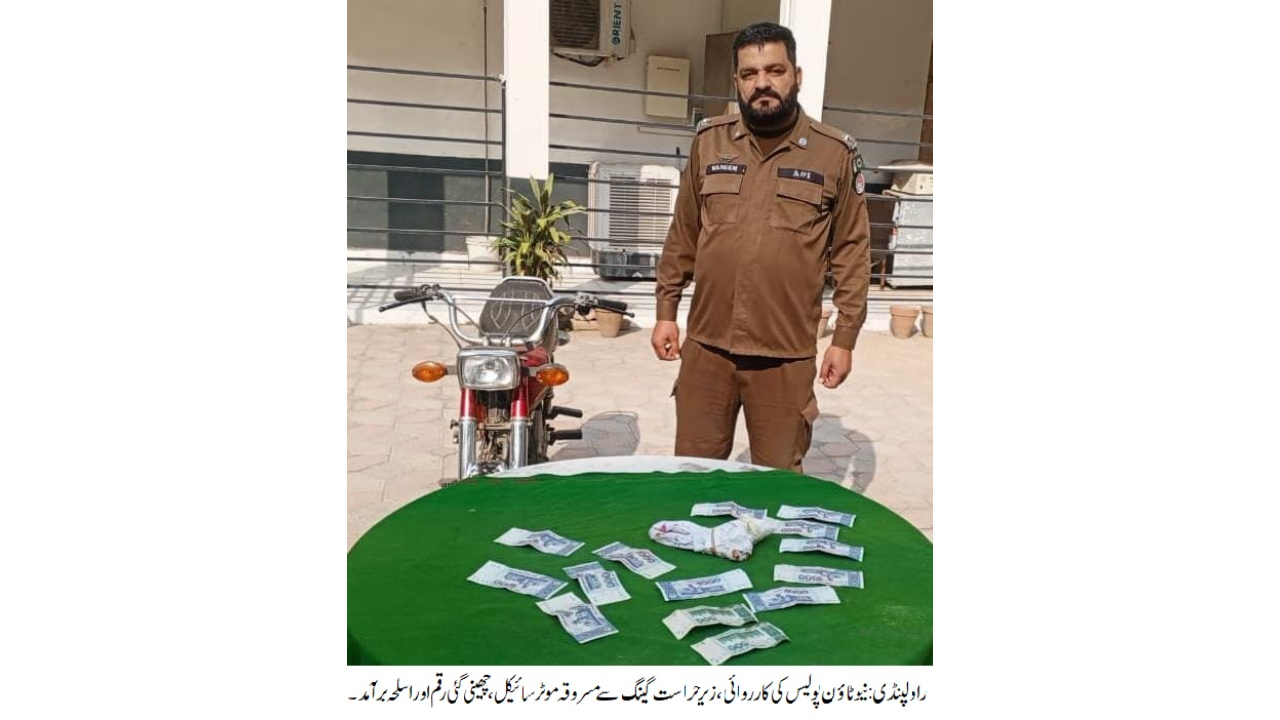 راولپنڈی (ٹی این ایس) ایس ایچ او تھانہ نیوٹاؤن لقمان پاشا کی ہمراہ پولیس ٹیم کارروائی، سٹریٹ کرائم اور موٹر سائیکل چوری کی وارداتوں میں ملوث 2 رکنی گینگ گرفتار،مسروقہ موٹر سائیکل،چھینی گئی رقم 13 ہزار روپے اور اسلحہ برآمد۔تفصیلات کے مطابق نیوٹاؤن پولیس نے کارروائی کرتے ہوئے سٹریٹ کرائم اور موٹر سائیکل چوری کی وارداتوں میں ملوث 2 رکنی گینگ کو گرفتار کرلیا،مسروقہ موٹر سائیکل،چھینی گئی رقم 13 ہزار روپے اور اسلحہ برآمد ہوا،ایس پی راول سعد ارشد کاکہنا تھا کہ زیرحراست افراد کو ٹھوس شواہد کے ساتھ چالان عدالت کیا جائے گا،شہریوں کوقیمتی اثاثہ سے محروم کرنے والے افراد قانون کی گرفت سے نہیں بچ سکتے۔