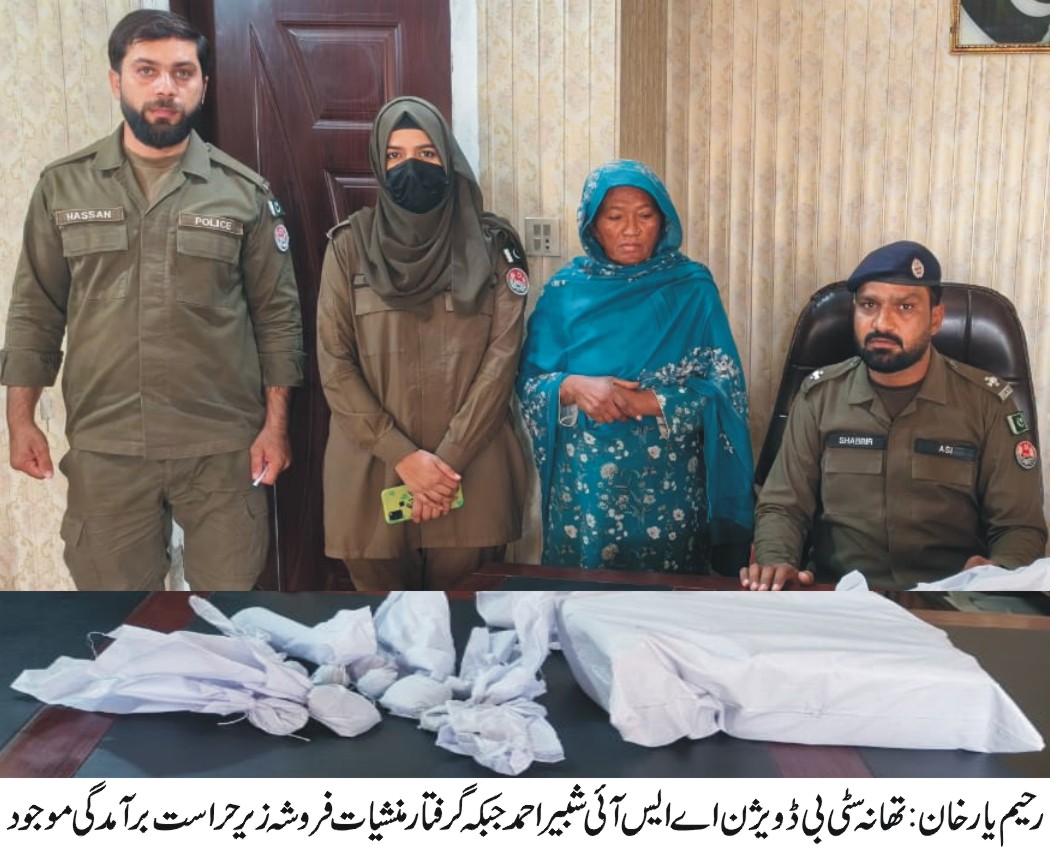 رحیم یارخان (ٹی این ایس) تھانہ سٹی بی ڈویژن پولیس کی بڑی کارروائی 10 کلو سے زائد چرس برآمد خاتون منشیات فروشہ گرفتار، مقدمہ درج۔ ایس ایچ او تھانہ سٹی بی ڈویژن شکیل احمد اور ٹیم کی ڈی ایس پی سٹی راؤ دلشاد کی نگرانی میں منشیات فروشوں کے خلاف کارروائیاں جاری ہیں، گزشت روز اسسٹنٹ سب انسپکٹر شبیر احمد نے دیگر پولیس پارٹی کے ہمراہ دوران گشت و پڑتال جرائم مخبر سے اطلاع پاتے ہوئے قبرستال دڑی سانگی کے قریب کامیاب چھاپہ مار کارروائی کے دوران عادی و ریکارڈی بدنام خاتون منشیات فروشہ کرم خاتون زوجہ غلام حسین سانگی کو 10 کلو 270 گرام چرس برآمد ہونے پر حسب ضابطہ رنگے ہاتھوں گرفتار کرتے ہوئے مقدمہ درج کر لیا۔