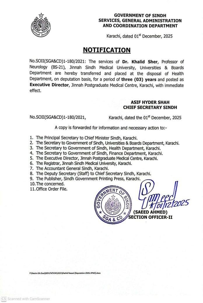 کراچی (ٹی این ایس) کراچی محکمہ سروسز، جنرل ایڈمنسٹریشن اینڈ کوآرڈینیشن ڈیپارٹمنٹ, حکومتِ سندھ کی جانب سے اہم نوٹیفکیشن جاری۔ پروفیسر ڈاکٹر خالد شیر کو جناح پوسٹ گریجویٹ میڈیکل سینٹر کے ایگزیکٹو ڈائریکٹر کے طور پر تین برس کے لیے تعینات کر دیا گیا ہے. ڈاکٹر خالد شیر، جو نیورولوجی کے سینئر پروفیسر ہیں، انہیں جے ایس ایم یو سے ڈیپوٹیشن پر ہیلتھ ڈیپارٹمنٹ کے لیے منتقل کیا گیا ہے۔ اس فیصلے کے بعد اسپتال کے عملے اور میڈیکل کمیونٹی میں اعتماد اور توقعات میں اضافہ دیکھا جا رہا ہے۔ ڈاکٹر خالد شیر ایک تجربہ کار فزیشن ہیں۔ ان کی انتظامی صلاحیتیں اور تدریسی پس منظر انہیں اس اہم ذمہ داری کے لیے موزوں بناتے ہیں۔ میڈیکل بورڈز کے سینئر نمائندگان نے کہا کہ ڈاکٹر خالد شیر کی تقرری اسپتال کے انتظامی ڈھانچے کو مستحکم کرے گی۔ طبی ماہرین کا کہنا ہے کہ ان کی قیادت میں جے پی ایم سی میں سروس ڈیلیوری، ایمرجنسی سسٹم، اور اسپتال مینجمنٹ میں بہتری کی توقع ہے۔ اسپتال کے اسٹاف نے ان کی تعیناتی پر خوشی کا اظہار کیا ہے۔پروفیسر ڈاکٹر خالد شیر کو نئی ذمہ داری پر مبارکباد پیش کی گئی ہے.
