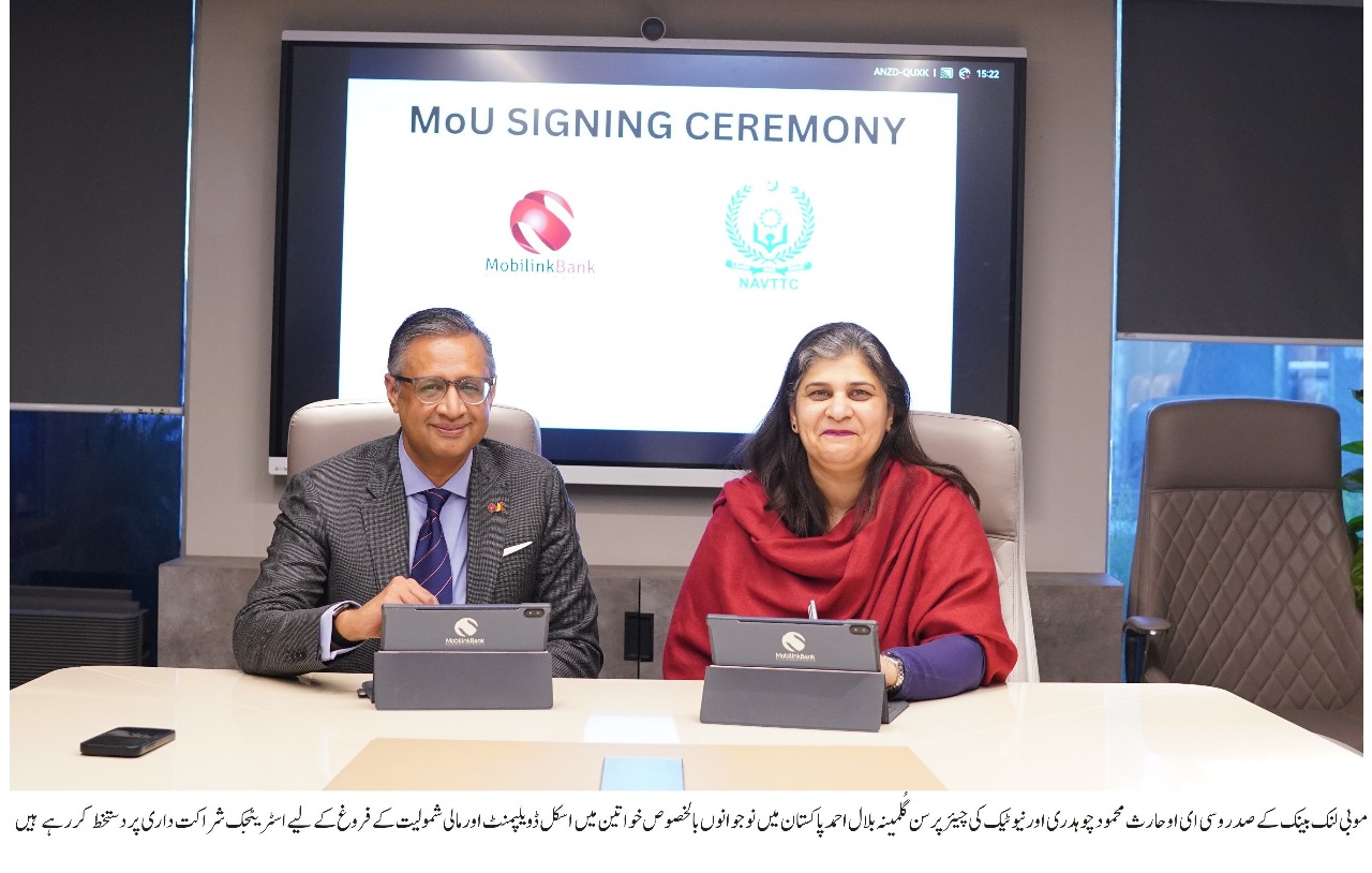 اسلام آباد، 2 دسمبر، 2025 (ٹی این ایس)۔ پاکستان کے صف اول کے ڈیجیٹل مائیکروفنانس بینک، موبی لنک بینک نے نیشنل ووکیشنل اینڈ ٹیکنیکل ٹریننگ کمیشن۔ نیوٹیک (نیوٹیک ) کے ساتھ اہم اشتراک کا اعلان کیا ہے، جس کا مقصد اسکلز ڈویلپمنٹ کو مضبوط بنانا، مالی شمولیت کو فروغ دینا اور پاکستان بھر کے نوجوانوں بالخصوص خواتین کو بہتر معاشی مواقع فراہم کرنا ہے۔