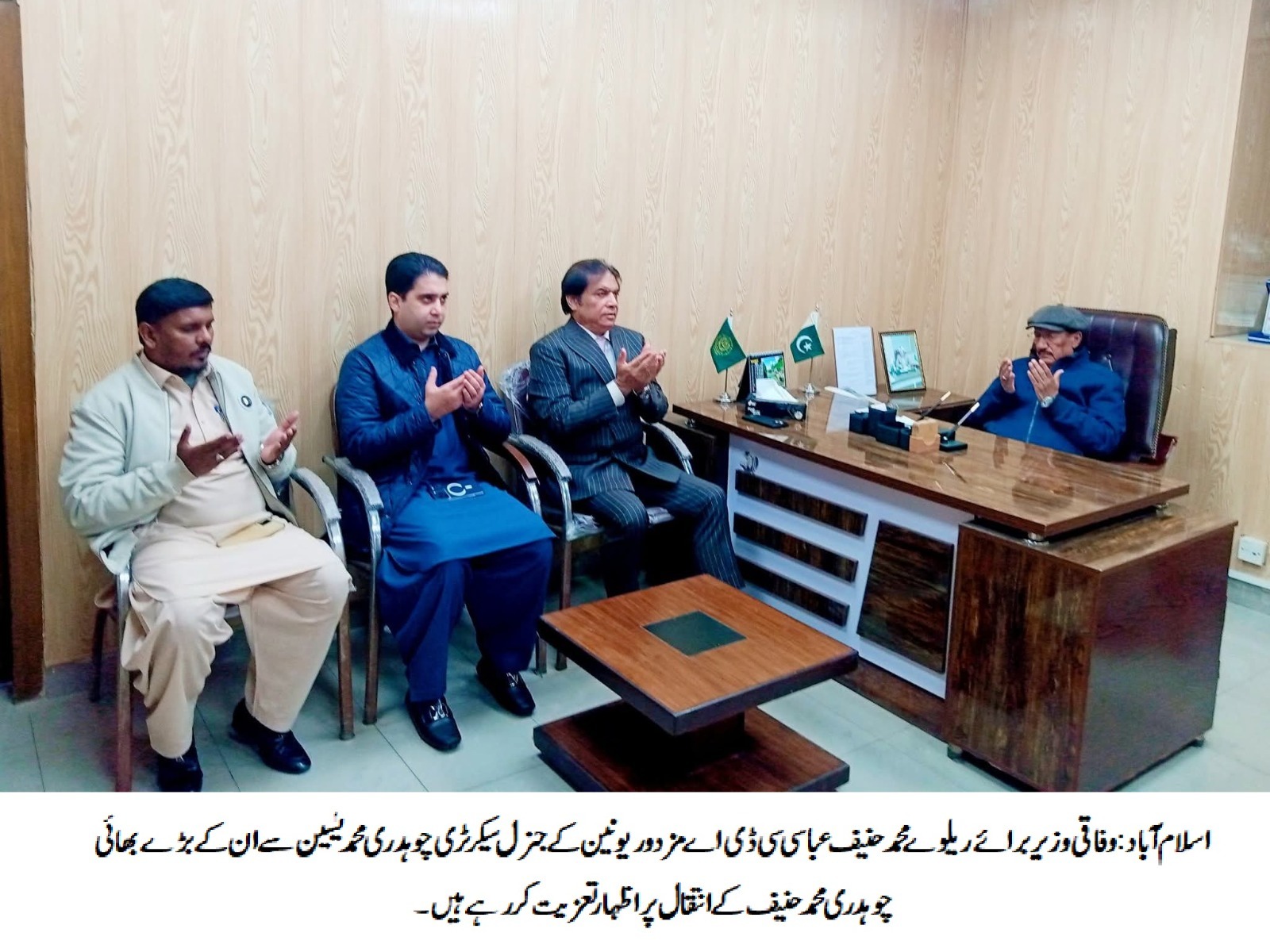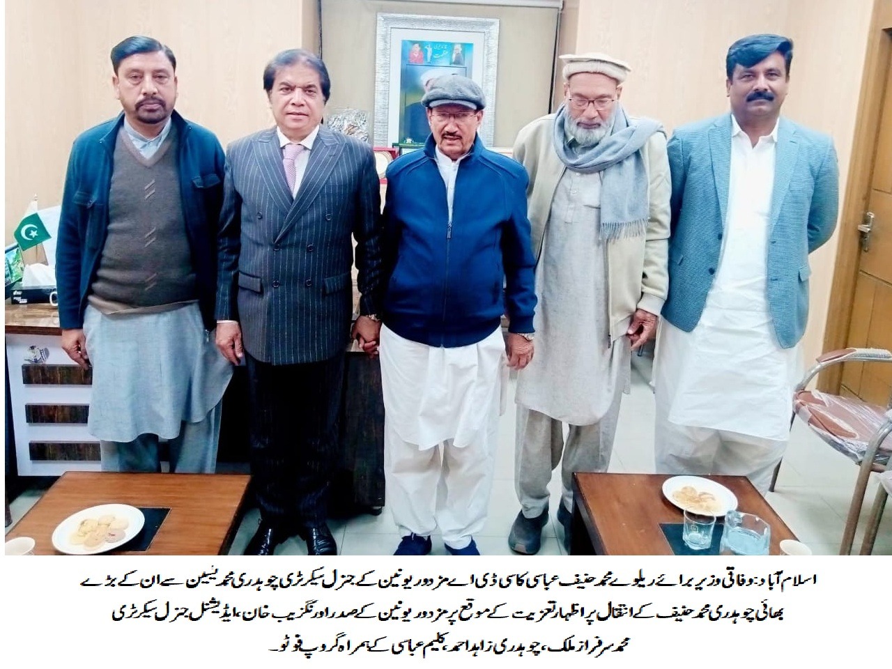 اسلام آباد (ٹی این ایس) وفاقی وزیر برائے ریلوے محمد حنیف عباسی نے سی ڈی اے مزدور یونین کے جنرل سیکرٹری چوہدری محمد یٰسین سے ان کی آفس میں ملاقات کی اور ان کے بڑے بھائی چوہدری محمد حنیف کے انتقال پر دلی تعزیت کا اظہار کیا۔اس موقع پر سی ڈی اے مزدور یونین کے صدراورنگزیب خان،ایڈیشنل جنرل سیکرٹری محمد سرفرازملک،چوہدری زاہد احمد،کلیم عباسی،ملک اسلم و دیگر عہدیداران بھی موجود تھے۔