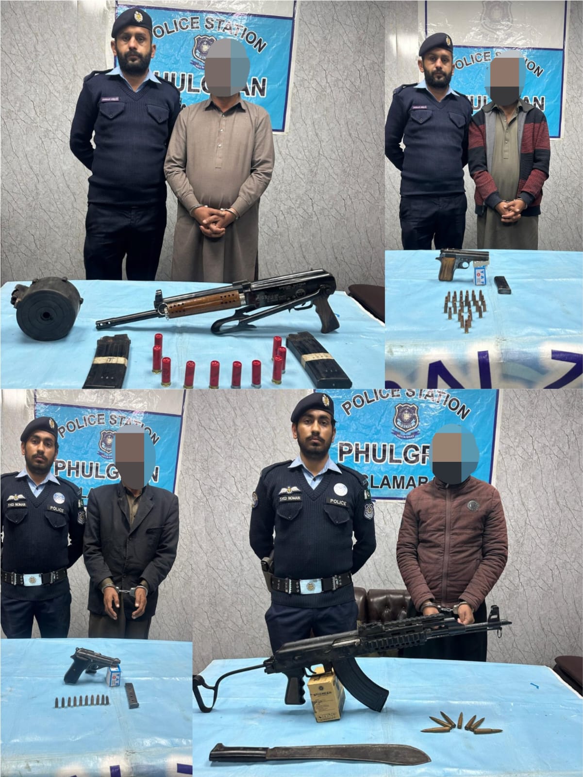 اسلام آباد (ٹی این ایس) پولیس کی “اسلحہ سے پاک شہر “مہم تیزی سے جاری ہے،اسی سلسلے میں تھا نہ پھلگراں پولیس ٹیم نے چار ملزمان کو گرفتار کرکے ان کے قبضہ سے بھا ری تعداد میں اسلحہ معہ ایمونیشن برآمد کر لیا۔ گرفتار ملزمان کے خلاف مقدمات درج کرکے مزید تفتیش شروع کر دی گئی ہے،ایس ایس پی آپریشنز قاضی علی رضا نے کہا کہ غیر قانونی اسلحے کے خلاف زیرو ٹالرنس پالیسی پر سختی سے عمل کیاجا رہا ہے،شہری اپنے لائسنس یافتہ اسلحے کو فوری طور پر متعلقہ تھانوں میں رجسٹر کرائیں
