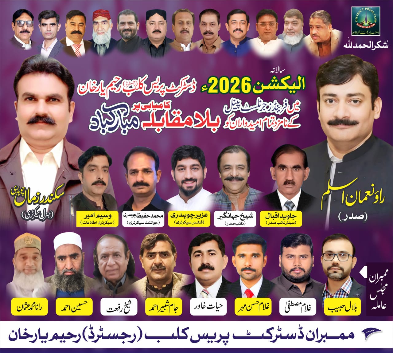 قومیرحیم یار خان رحیم یارخان (ٹی این ایس) ڈسٹرکٹ پریس کلب (رجسٹرڈ) رحیم یارخان سال 2026 کی نومنتخب کابینہ By TNS - December 22, 2025 9:57 am 0 16 Share on Facebook Tweet on Twitter رحیم یارخان (ٹی این ایس) ڈسٹرکٹ پریس کلب (رجسٹرڈ) رحیم یارخان سال 2026 کی نومنتخب کابینہ