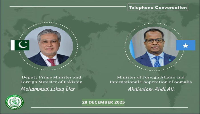 اسحاق ڈار نے صومالیہ کی خودمختاری اور علاقائی سالمیت کے لیے پاکستان کی مکمل حمایت کا اعادہ کیا اور ایسی کسی بھی کارروائی کی مذمت کی جو ان کے وقار یا سالمیت کو نقصان پہنچانے کی کوشش کرے۔ صومالی وزیر خارجہ عبدالسلام علی نے پاکستان کی مسلسل حمایت پر اسحاق ڈار کا شکریہ ادا کیا اور کہا کہ پاکستان کا کردار صومالیہ کے لیے نہایت اہم ہے۔علاوہ ازیں اسحاق ڈار نے یقین دہانی کرائی کہ پاکستان سلامتی کونسل سمیت ہر متعلقہ فورم پر صومالیہ کے لیے مکمل تعاون فراہم کرے گا۔