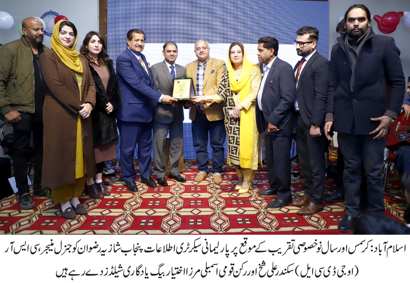 اسلام آباد (ٹی این ایس) کرسمس اورسال نو کی خوشی کے موقع پر منیارٹی جرنلسٹس ایسوسی ایشن اسلام آباد کی جانب سے خصوصی تقریب کااہتمام کیاگیا جس میں آئل اینڈ گیس ڈویلپمنٹ کمپنی لمیٹڈ(اوجی ڈی سی ایل )کے ایم ڈی /سی او احمد حیات لک اور جنرل منیجر،سی ایس آر (اوجی ڈی سی ایل)سکندرعلی شخ، فرح ،صدام نے بطور مہمان خصوصی شرکت کی ۔تقریب میں رکن قومی اسمبلی مرزا اختیار بیگ، پارلیمانی سیکرٹری تعلیم فرح نازاکبر ،پارلیمانی سیکرٹری اطلاعات پنجاب شازیہ رضوان ،صدر پی ایف یو جے افضل بٹ ،صدرآر آئی یو جے چوہدری طارق علی ورک سمیت کرسچین جرنلسٹس کی فیملیز نے بھرپور شرکت کی ۔اس موقع پرتقریب سے خطاب کرتے ہوئے جنرل منیجر،سی ایس آر (اوجی ڈی سی ایل)سکندرعلی شخ نے ایم ڈی اوجی ڈی سی احمد حیات لک کا خصوصی پیغام دیا انہوں نے کہا کہ کرسچین جرنلسٹس سمیت دیگر اقلیتیں اس ملک کااہم حصہ ہیں جس طرح پاکستان پر ہماراحق ہے اور ہمیں حقوق حاصل ہیں اسی طرح تمام اقلیتوں کابھی اس پر اتنا ہی حق ہے۔انہوں نے کرسچیئن جرنلسٹس کو کرسمس اورنئے سال کی مبارک بادی اور کرسچین فیملی کے بچوں میں نقدکیش اورتحائف تقسیم کئے جس سے بچوں کی خوشی دوبالاہوگئی ۔تقریب سے رکن قومی اسمبلی مرزا اختیار بیگ، پارلیمانی سیکرٹری تعلیم فرح نازاکبر ،پارلیمانی سیکرٹری اطلاعات پنجاب شازیہ رضوان ،صدر پی ایف یو جے افضل بٹ ،صدرآر آئی یو جے چوہدری طارق علی ورک نے بھی خصوصی خطاب کیااور کرسچین کمیونٹی کیلئے اپنے بھرپور تعاون اورنیک تمناؤں کااظہار کیا۔صدر منیارٹی جرنلسٹس ایسوسی ایشن ناصر سلیم اور فنانس سیکرٹری منیارٹی جرنلسٹس ایسوسی ایشن سنی مسیح نے اس موقع پر’ ’او جی ڈی سی ایل “ کے ایم ڈی احمد حیات لک اور جنرل منیجر ،سی ایس آرسکندر علی شیخ اورسی ایس آر کی پوری ٹیم کااس تقریب کااہتمام کرنے پر خصوصی شکریہ اداکیا۔انہوں نے کہاکہ او جی ڈی سی ایل کی جانب سے گزشتہ تین سالوں سے مسلسل منیارٹی جرنلسٹس کے لئے یہ خصوصی تقریب منعقد کی جاتی ہے ان کے بھرپورتعاون کامیں اور میرے تمام کرسچین جرنلسٹس تہہ دل سے مشکور ہے ۔ان کی اس والہانہ محبت کو ہم اورہماری تمام کرسچین فیملیز ہمیشہ اپنے خصوصی دعاؤں میں یاد رکھے گی ۔تقریب کے آخر میں آنے والے معزز مہمانوں میں خصوصی یادگاری شیلڈز بھی پیش کی گئیں ۔ علاوہ ازیں تقریب میں ”او جی ڈی سی ایل “کی جانب سے کرسمس اور نئے سال کاکیک بھی کاٹاگیاجبکہ شرکاء کیلئے خصوصی ڈنر کابھی اہتمام کیاگیا۔
