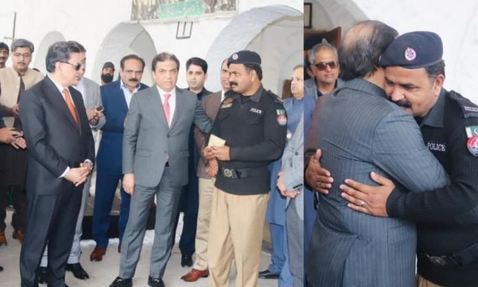 ریلوے اسٹیشن لانڈھی، کراچی میں ریلوے پولیس کراچی ڈویژن کے اہلکار کانسٹیبل راؤ شریف سے ملاقات کی اور مسافر کی 38 لاکھ روپے کی رقم ایمانداری سے واپس کرنے پر اپنے وعدے کے مطابق انہیں اپنی جیب سے ایک لاکھ روپے نقد انعام دیا۔