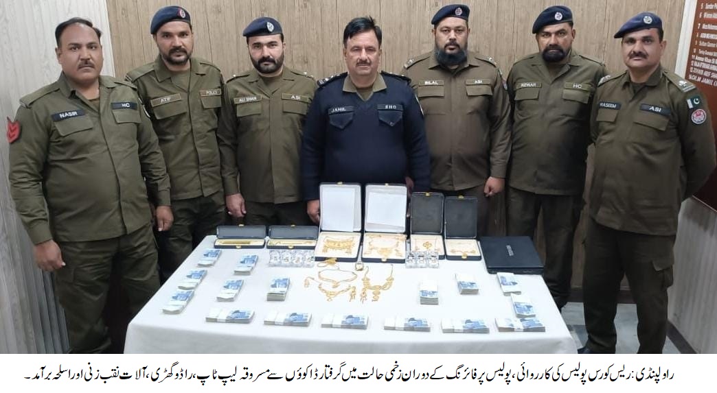 راولپنڈی (ٹی این ایس) (مظہر شاہ)ایس ایچ او ریس کورس چوھدری جمیل کی سربراهی میں پولیس ٹیم کی اہم پیشرفت ۔ پولیس پر فائرنگ کے دوران زخمی حالت میں گرفتار ڈاکوؤں سے تفتیش میں 1 کروڑ 40 لاکھ سے زائد مالیت کے 30 تولہ مسروقہ طلائی زیورات، رقم 16 لاکھ 63 ہزار روپے برآمد۔ تفصیلات کے مطابق پولیس پر فائرنگ کے دوران زخمی حالت میں گرفتار ڈاکوؤں سے تفتیش میں اہم پیشرفت، تھانہ ریس کورس پولیس نے کارروائی کرتے ہوئے زخمی حالت میں گرفتاردو ڈاکوؤں سے1 کروڑ 40 لاکھ سے زائد مالیت کے 30 تولہ مسروقہ طلائی زیورات،رقم 16 لاکھ 63 ہزار روپے برآمدکرلی، زیر حراست ڈاکوؤں سے مسروقہ لیپ ٹاپ،راڈو گھڑی و موٹر سائیکل،آلات نقب زنی اور اسلحہ بھی برآمد ہوا، زیر حراست افراد نے دوران تفتیش ڈکیتی اور چوری و نقب زنی کی متعدد وارداتوں کا انکشاف کیا، زیر حراست افراد کے انکشاف اور نشاندہی پر برآمدگی عمل میں لائی گئی، زیر حراست افراد کو ایک ماہ قبل گرفتار کیا گیا تھا،ایس پی پوٹھوہار طلحہ ولی کا کہنا تھا کہ زیر حراست افراد کو ٹھوس شواہد کے ساتھ چالان عدالت کیا جائے گا۔