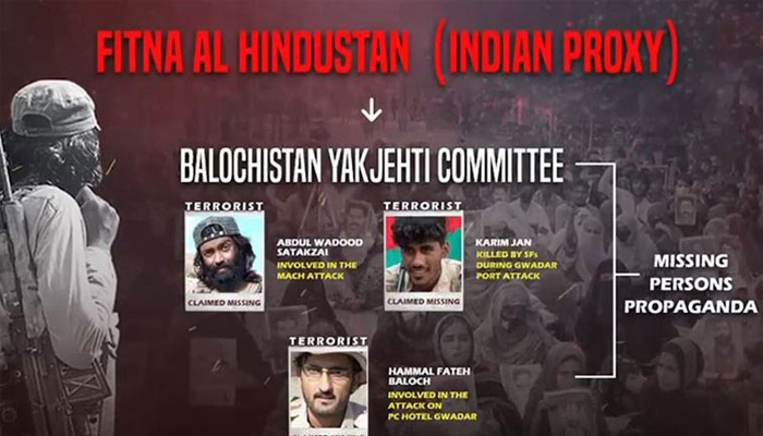 مارچ 2025، جعفر ایکسپریس واقعے کے بعد ڈی جی آئی ایس پی آر نے انتباہ کیا تھا کہ؛ بلوچستان میں دہشت گردی اور دہشت گردوں کی سپورٹ کے لئیے ان پراکسیز کے ذریعے منظم پروپیگنڈا مہم چلائی جاتی ہے۔ بلوچ یکجہتی کمیٹی نے ماہرنگ بلوچ کی قیادت میں ہسپتالوں سے ہلاک دہشت گردوں کی لاشیں زبردستی تحویل میں لینے کی کوشش کی، اس واقعے کو ذرائع ابلاغ نے بھی نمایاں طور پر رپورٹ کرتے ہوئے شناخت اور قانونی عمل میں رکاوٹ ڈالنے کی مجرمانہ کوشش قرار دیا۔دہشت گردوں کی ہلاکتوں کو فوری طور پر لاپتہ افراد کے بیانیے میں شامل کر کے حقائق، شناخت اور وابستگی سامنے آنے سے پہلے ہی متاثرہ ہونے کا تاثر قائم کیا جاتا ہے۔23 مئی 2025 کو ڈی جی آئی ایس پی آر نے پریس کانفرنس میں واضح طور پر کہا کہ؛ بلوچ یکجہتی کمیٹی اور اس کی قیادت مبینہ طور پر دہشت گرد نیٹ ورکس کی پراکسی اور سہولت کار کے طور پر کام کر رہی ہے۔ڈی جی آئی ایس پی آر نے کہا کہ جبری گمشدگیوں کے بیانیے کو منظم انداز میں بطور ہتھیاراستعمال کیا جاتا ہے۔گذشتہ دنوں سی ٹی ڈی، پولیس اور دیگر قانون نافذ کرنے والے اداروں نے تربت کے رہائشی ساجد احمد کو گرفتار کیا۔ڈی آئی جی اعتزاز گورایا کے مطابق؛ ساجد احمد بین الاقوامی اسلامی یونیورسٹی اسلام آباد سے سوشیالوجی میں ماسٹرز کی ڈگری یافتہ ہے اور سرکاری کالجوں سمیت یونیورسٹی آف تربت میں بطور لیکچرار تعینات رہا۔