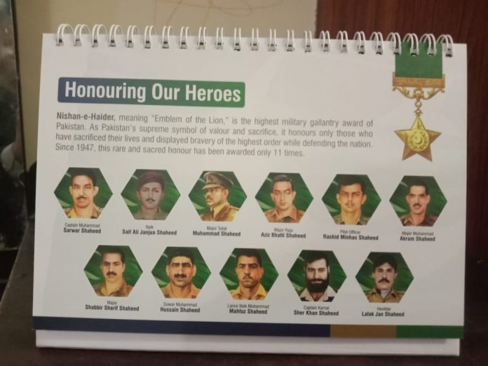 لاہور (ٹی این ایس) آرمی ویلفیئر ٹرسٹ انویسٹمنٹ لمیٹڈ نے ‘نشان حیدر’ ہولڈرز کی حراج تحسین پیش کرنے کے لیے کیلنڈر2026 جاری کیا ہے’ جس کے لےچیف ایگزیکٹو آفیسر سجاد انور نے خصوصی ہدایات جاری کی تھیں’ شہدا کے اہل خانہ اور پاکستان سے محبت کرنے والے حلقوں نے سجاد انور کی اس کاوش کو سراہا’ ہمارے ہیروز کے عنوان سے جاری کیلنڈر کو پاکستان بھر میں بہت پذیرائی ملی’ جس میں کیپٹن سرور شہید، سیف علی جنجوعہ، میجر طفیل محمد، میجر عزیز بھٹی، راشد منہاس، میجر اکرم، میجر شبیر شریف، سوار محمد حسین، لانس نائیک محفوظ، کیپٹن شیر خان اور لالک جان کی زندگی کی کہانی اور بہادری تاریخی انداز میں بیان کیا گیا ہے ‘ نشان حیدر ریسرچ فورم کے چیف ایگزیکٹو عباس بیگ مرزا نے جناب سجاد انور کی اس کاوش کو گرانقدر خدمت قرار دیا ہے