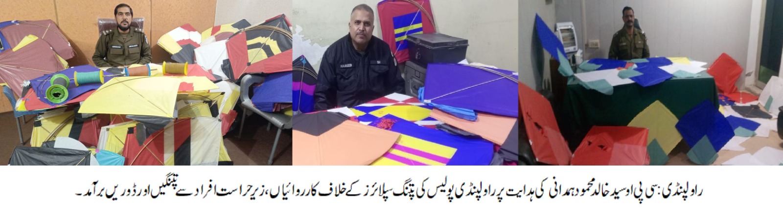 راولپنڈی (ٹی این ایس) پولیس کی پتنگ سپلائر کے خلاف کاروائیاں 06 پتنگ باز گرفتار سینکڑوں افراد سے پتنگیں اور ڈوریں برآمد، کاروائیاں تھانہ واہ کینٹ اور تھانہ صادق آباد کے مختلف علاقوں میں کی گئیں زیرحراست افراد کے خلاف الگ الگ مقدمات درج کر کے گرفتار کر لیا،گداگروں کے خلاف کریک ڈاؤن میں 19روز کے دوران شہر بھر سے 246 پیشہ ور بھکاری گرفتار ہوئے زیر حراست افراد میں117 مرد 119 خواتین اور 10 خواجہ سرا شامل ہیں،پیشہ ور گداگر مصروف شاہراؤں پر ٹریفک میں رکاوٹ اور شہریوں کے لیے زحمت کا باعث بنتے ہیں بیشتر چوری منشیات فروشی اور دیگر جرائم میں ملوث ہیں،منشیات اور غیر قانونی اسلحہ کے خلاف کاروائیوں کے دوران 06 افرا کو حراست میں لیکر 30 لیٹر شراب اسلحہ معہ ایمونیشن برامد کر لیا،زیر حراست افراد کے خلاف کاروائیاں تھانہ روات، تھانہ چکلالہ، تھانہ صدرواہ اور تھانہ آراے بازار کے علاقوں میں کی گئیں،ڈویژنل ایس پیز کے مطابق منشیات اور ناجائز اسلحہ رکھنے والے افراد قانون کی گرفت سے نہیں بچ سکتے