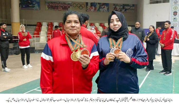 راولپنڈی (ٹی این ایس) (مظہر شاہ )راولپنڈی پولیس کی دو لیڈیز پولیس افسران کا اعزاز، لیڈی انسپکٹر ارم خانم نے 4واں فٹنس چیلنج چمپئن شپ کے مقابلوں میں 2 گولڈ میڈل اور 1 براؤنز میڈل حاصل کیا،اسسٹنٹ سب انسپکٹر شائستہ بتول نے 1 سلور میڈل اور 1 براؤنز میڈل حاصل کیا۔ تفصیلات کے مطابق راولپنڈی پولیس کی دو لیڈیز پولیس افسران کا اعزاز، لیڈی انسپکٹر ارم خانم نے 4thفٹنس چیلنج چمپئن شپ کے مقابلوں میں 2 گولڈ میڈل اور 1 براؤنز میڈل حاصل کیا،اسسٹنٹ سب انسپکٹر شائستہ بتول نے 1 سلور میڈل اور 1 براؤنز میڈل حاصل کیا، مقابلوں کا انعقاد 2 فروری 2026 کو پشاور میں ہوا،پولیس افسران کو کھیلوں کے مواقع فراہم کر کے انکی صلاحیتوں کو سامنے لانے کے لئے راولپنڈی پولیس تمام وسائل بروئے کار لا رہی ہے۔