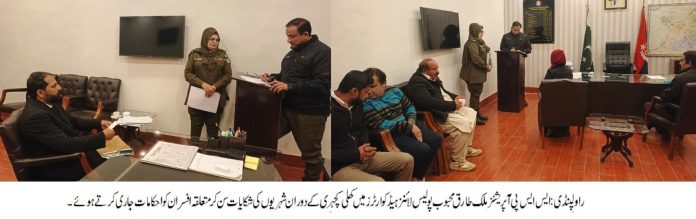 راولپنڈی (ٹی این ایس) ایس ایس پی آپریشنز ملک طارق محبوب کی پولیس لائنز ہیڈ کوارٹر میں کھلی کچہری ایس ایس پی اپریشنز نے شہریوں کی شکایات سن کر ان کے حل کے لیے متعلقہ افسران کو احکامات جاری کیے مار کردہ درخواستوں پہ دیے گئے ٹائم فریم کے اندر قانونی کاروائی کو یقینی بنایا جائے ایس ایس پی اپریشنز کی متعلقہ افسران کو ہدایت،شہریوں کے مسائل کے فوری حل میں کسی قسم کی غفلت برداشت نہیں کی جائے گی ایس ایس پی آپریشن نے شہریوں کی شکایت سن کر ان کے حل کے لیے متعلقہ افسران کو احکامات جاری کیے تھانوں میں شہریوں کے لیے بہترین سروس ڈلیوری کو ہمہ وقت یقینی بنایا جائے