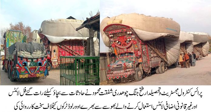 فتح جنگ (ٹی این ایس) پرائس کنٹرول مجسٹریٹ و تحصیلدار فتح جنگ چوھدری شفقت محمود جنہیں ٹریفک مجسٹریٹ کے اختیارات بھی حاصل ہیں کی زیرِ نگرانی رات کے اوقات میں فل لائٹس اور غیر قانونی اضافی لائٹس استعمال کرنے والی چھ بھوسے والے ٹرکوں کے خلاف سخت اور بلاامتیاز کارروائی کی گئی، اضافی غیر قانونی لائٹس قبضے میں لے لی گئیں جس کا مقصد ٹریفک قوانین کی کھلی خلاف ورزیوں کا خاتمہ اور شہریوں کی جان و مال کا تحفظ ہے۔ کارروائی کے دوران ایک سیمنٹ سے لوڈ ٹرک بھی تحویل میں لے کر ڈرائیور کو گرفتار کیا گیا جبکہ دو ٹرالے بھی بند کیے گئے، مجموعی طور پر چھ ٹرکوں اور 22 ویلرز کے خلاف قانون کے مطابق کارروائی عمل میں لائی گئی۔ اس موقع پر چوھدری شفقت محمود نے سخت الفاظ میں واضح کیا کہ فل لائٹس اور ایکسٹرا لائٹس استعمال کرنے والوں کے ساتھ کسی قسم کی نرمی نہیں برتی جائے گی اور سفارش یا دباؤ ڈالنے والوں کے خلاف مزید سخت ایکشن لیا جائے گا۔ انہوں نے خبردار کیا کہ عوام کی جانوں سے کھیلنے والوں کو کسی صورت معاف نہیں کیا جائے گا، یہ آپریشن روزانہ کی بنیاد پر بالخصوص رات کے وقت جاری رہے گا، کسی اہلکار کی غفلت ناقابلِ برداشت ہوگی اور ٹریفک قوانین کی خلاف ورزی پر زیرو ٹالرنس پالیسی کے تحت کارروائی یقینی بنائی جائے گی۔