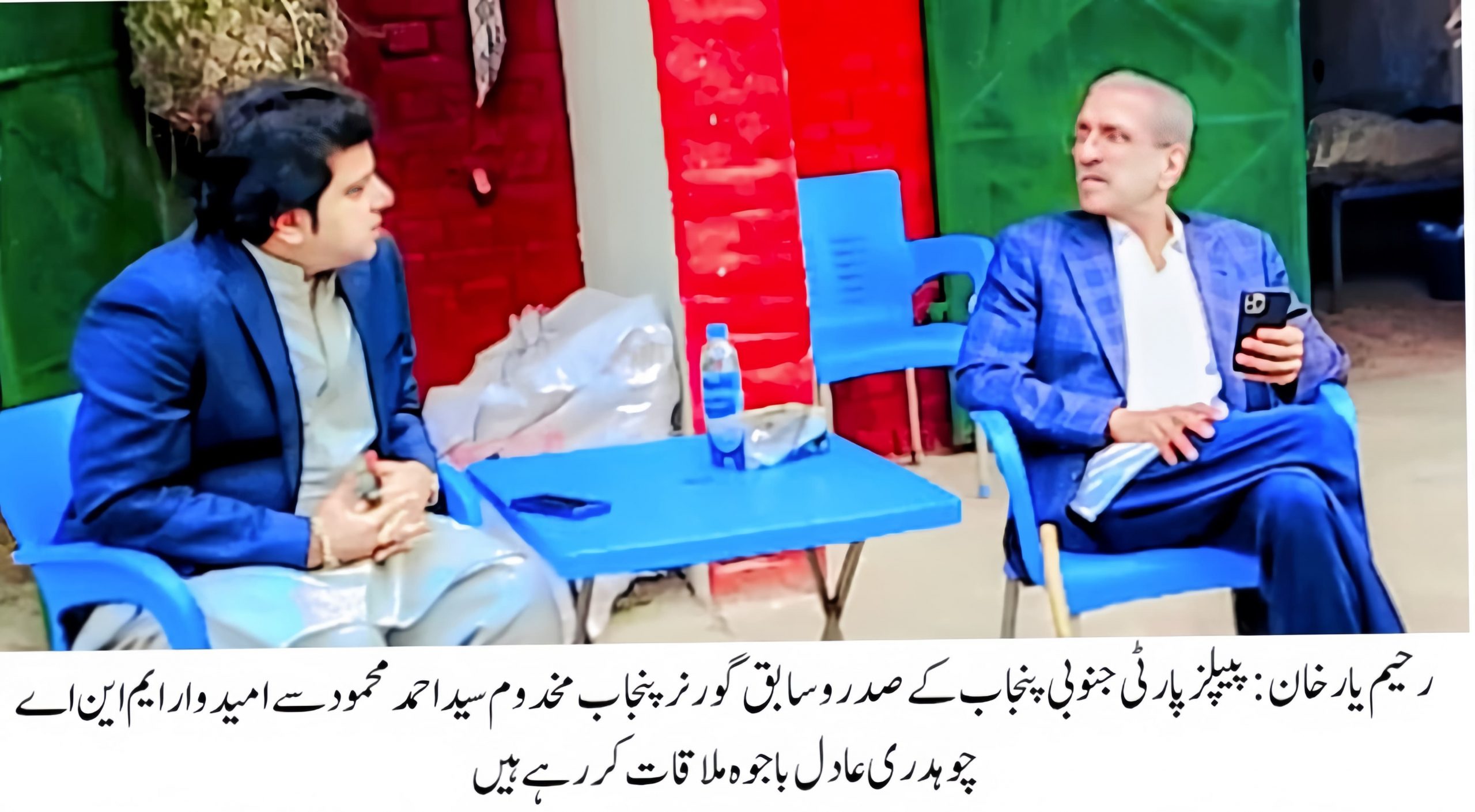 رحیم یارخان:پیپلزپارٹی جنوبی پنجاب کے صدروسابق گورنرپنجاب مخدوم سید احمد محمود سےپارٹی کے حلقہ این اے 172سے امیدوارایم این اے چوہدری عادل باجوہ ملاقات کررہے ہیں