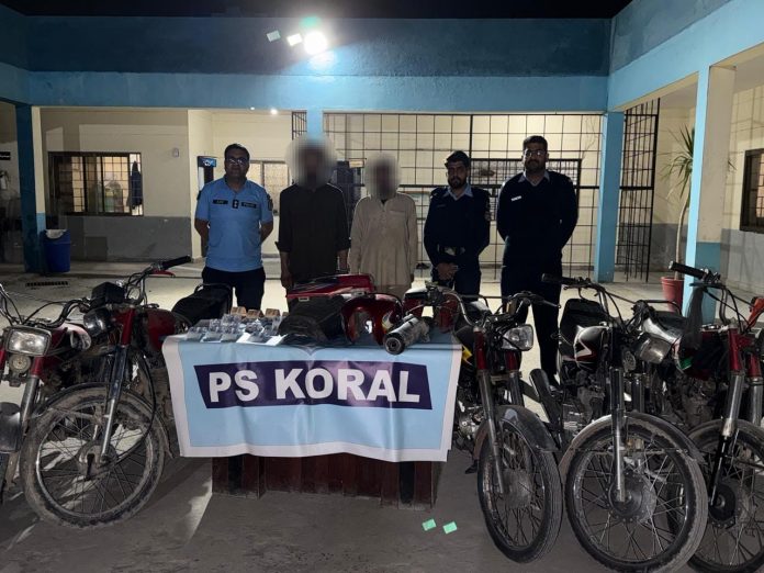 اسلام آ باد (ٹی این ایس) تھانہ کورال پولیس کی مو ٹر سائیکلوں چوری میں ملوث ملزمان کے خلاف بڑ ی کا رروائی۔موٹر سائیکل چوری میں ملو ث منظم گر وہ کے دو ارکان گرفتار،ملزمان کے قبضہ سے10عدد مسروقہ مو ٹر سائیکل، نقدی اور وارداتو ں میں استعمال ہو نے والا اسلحہ معہ ایمو نیشن برآمد،گرفتار ملزمان کے خلاف مقدمات درج،مزید تفتیش جاری ہے۔تفصیلات کے مطابق انسپکٹر جنر ل آ ف پولیس اسلام آ باد سید علی نا صر رضوی کے خصوصی احکا ما ت کی روشنی میں اسلام آ باد پولیس کا وفاقی دارالحکومت میں جر ائم پیشہ عنا صراور مو ٹر سائیکل چوری کی وارداتوں میں ملوث ملزمان کیخلاف بلا تفریق کارروائیوں کا سلسلہ جاری ہے،اس سلسلے میں تھانہ کو رال پولیس ٹیم نے مو ٹر سائیکل چوری کی متعدد وارداتوں میں ملوث منظم گر وہ کے دو ارکان کو گرفتار کرلیا، گرفتار ملزمان کی شناخت ابر اہیم خا ن اور خر م حسین کے ناموں ہوئی ہے،ملزمان کے قبضہ سے دس مسروقہ مو ٹر سائیکل، نقدی اور وارداتو ں میں استعمال ہونے والا اسلحہ معہ ایمو نیشن بھی برآمد کرلیا گیا، ابتدائی تفتیش کے دوران گرفتار ملزمان نے متعدد وارداتیں کرنے کا انکشاف کیا ہے،ملزمان کے خلاف مقدمات درج ہیں،مزید تفتیش جاری ہے،