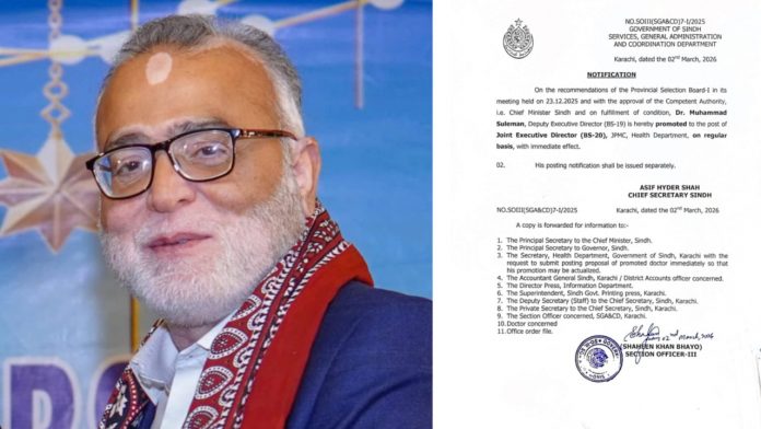 کراچی (ٹی این ایس) جناح اسپتال میں میرٹ کا بول بالا ڈاکٹر محمد سلمان جوائنٹ ایگزیکٹو ڈائریکٹر مقرر