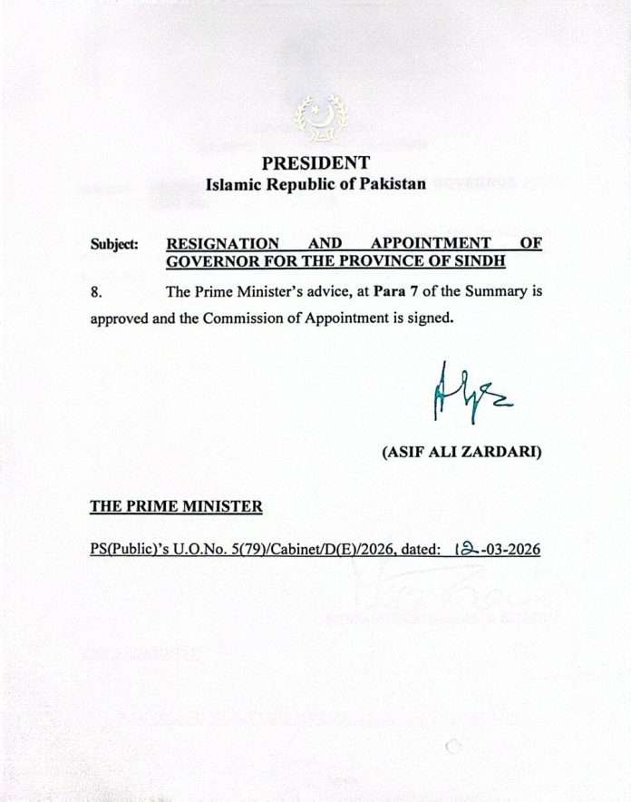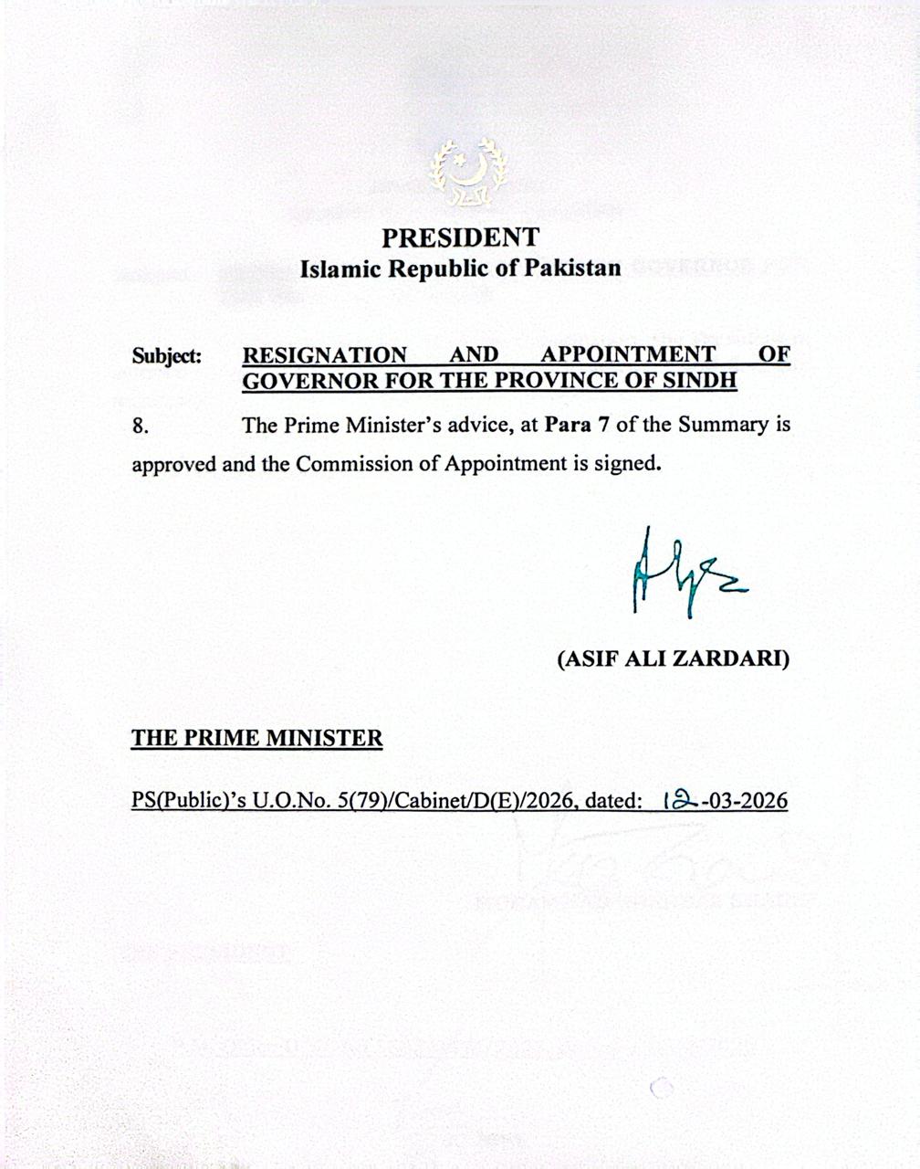 صدرِ مملکت نے وزیرِ اعظم کی ایڈوائس پر آئینِ اسلامی جمہوریہ پاکستان کے آرٹیکل 48 اور 101 کے تحت گورنر سندھ کے عہدے کے لیے نہال ہاشمی کی تقرری کی سمری کی منظوری دے دی۔