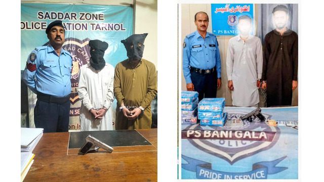اسلام آباد (ٹی این ایس) پولیس کا جر ائم کے انسداد اور جرائم پیشہ عناصر کی گرفتاری کیلئے موثر کریک ڈاون جاری۔سنگین جرائم میں ملوث 14 مجرمان اشتہاریوں سمیت 30 جرائم پیشہ عناصر گرفتار۔ ملزمان کے قبضہ سے منشیا ت اور اسلحہ معہ ایمونیشن برآمد۔گرفتار ملزمان کے خلاف مقدمات درج۔مزید تفتیش جاری ہے۔تفصیلات کے مطابق انسپکٹر جنرل آف پولیس اسلام آباد سید علی ناصر رضوی کے خصوصی احکامات پر اسلام آباد پولیس کا وفاقی دارلحکومت میں شہریوں کی جان ومال کے تحفظ کو یقینی بنانے کیلئے جرائم کے انسداد اور جرائم پیشہ عناصر کی گرفتار ی کے لئے موثر کریک ڈاو¿ن جاری ہے۔اس سلسلے میں تھانہ کوہسار، تھانہ مارگلہ،تھانہ کراچی کمپنی، تھانہ کھنہ، تھانہ لوہی بھیر، تھانہ شہزاد ٹاو¿ن اور تھانہ بنی گالہ پولیس ٹیموں نے 16 ملزمان کو گرفتار کرکے ان کے قبضہ سے 3,362گرام آئس، 150 گرام ہیروئن،20بوتلیں شراب، مختلف بور کے10عدد پستول معہ ایمونیشن اور ایک خنجر برآمد کرلیا ۔گرفتار ملزمان کے خلاف مقدمات درج کرکے مزید تفتیش جاری ہے جبکہ مجرمان اشتہا ری اور عدالتی مفرروان کی گرفتاری کیلئے چلائی جانے والی خصوصی مہم کے دوران 14 مجرمان کی گرفتاری عمل میں لا ئی گئی۔ایس ایس پی آپریشنز اسلام آباد قاضی علی رضا نے کہا کہ اسلام آباد پولیس وفاقی دارلحکومت میں شہریوں کی جان ومال کے تحفظ کو یقینی بنانے کیلئے ہمہ وقت مصروف عمل ہے۔کسی بھی عناصر کو شہریوں کے امن میں خلل ڈالنے کی اجازت نہیں دی جائے گی۔شہریوں کی جان ومال کی حفاظت اسلام آباد پولیس کی اولین ترجیح ہے۔ شہریوں سے بھی گزارش ہے کہ کسی بھی مشکوک سرگرمی کے متعلق متعلقہ تھانہ یاایمرجنسی ہیلپ لائن “پکار”15-پرفوری اطلاع دیں تاکہ پولیس اور عوام کے باہمی تعاون سے شہر کو جرائم سے پاک کیاجاسکے