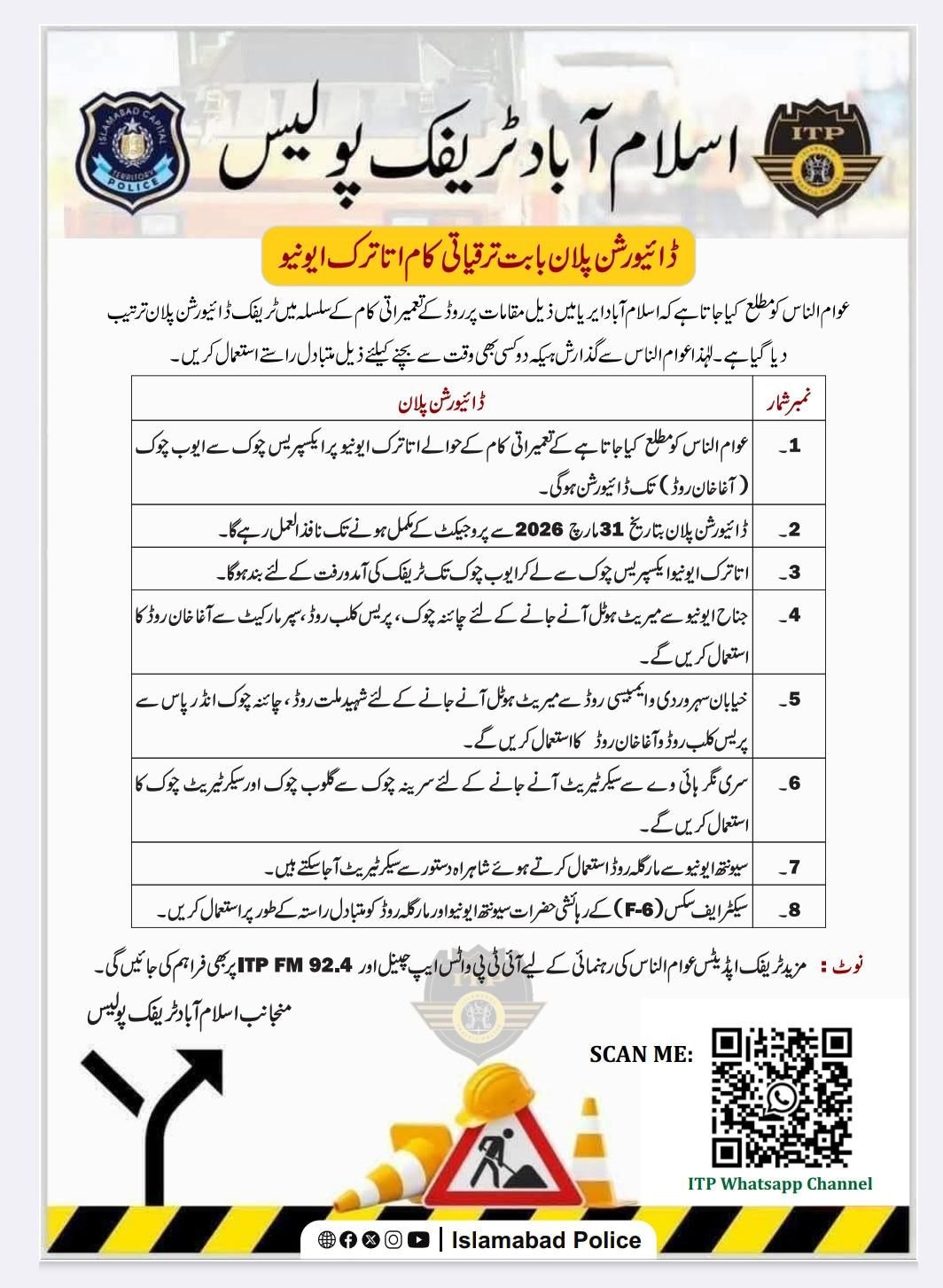 اسلام آباد (ٹی این ایس) اسلام آباد ٹریفک پولیس نے وفاقی دارلحکومت میں تعمیراتی کام کے حوالے سے ڈائیورشنز پلان جاری کر دیا۔شہریوں کی سہولت کے لئے متبادل راستوں کا انتظام کیا گیا ہے۔تمام افسران شہر میں ٹریفک کی روانی کی برقرار رکھنے کے ساتھ شہریوں کو متاباد ل راستوں کے متعلق آگاہی فراہم کریں۔تفصیلات کے مطابق اسلام آباد ٹریفک پولیس نے وفاقی دارلحکومت میں تعمیراتی کام کے حوالے سے ڈائیورشنز پلان جاری کر دیا۔یہ ڈائیورشن پلان بتاریخ 31 مارچ 2026 سے پروجیکٹ کے مکمل ہونے تک نافذالعمل رہے گا۔شہریوںکی سہولت کے لئے متبادل راستوں کا انتظام کیا گیا ہے۔تعمیراتی کام کے حوالے سے اتاترک ایونیو پر ایکسپریس چوک سے ایوب چوک (آغا خان روڈ) تک ڈائیورشن ہوگی۔اتاترک ایونیو ایکسپریس چوک سے لے کر ایوب چوک تک ٹریفک کی آمدورفت کے لئے بند ہوگا۔اس طرح جناح ایونیوسے میریٹ ہوٹل آنے جانے کے لئے چائنہ چوک ، پریس کلب روڈ، سپر مارکیٹ سے آغا خان روڈ کا استعمال کریں گے جبکہ خیابان سہروردی وایمبیسی روڈ سے میریٹ ہوٹل آنے جانے کے لئے شہید ملت روڈ ، چائنہ چوک انڈر پاس سے پریس کلب روڈ و آغا خان روڈ کا استعمال کریں گے۔مزید سری نگر ہائی وے سے سیکرٹریٹ آنے جانے کے لئے سرینہ چوک سے گلوب چوک اور سیکرٹریٹ چوک کا استعمال کریں گے۔سیونتھ ایونیو سے مارگلہ روڈ استعمال کرتے ہوئے شاہراہ دستور سے سیکرٹیریٹ آ جا سکتے ہیں جبکہ سیکٹر ایف سکس کے رہائشی حضرات سیونتھ ایونیو اور مارگلہ روڈ کو متبادل راستہ کے طور پر استعمال کریں۔چیف ٹریفک آفیسر اسلام آباد محمد سرفراز ورک نے کہا کہ جہاں جہاں روڈ بند کئے جا ئیں گے وہاں متبادل راستہ مہیا کرنے کے لئے ٹریفک پولیس کے افسران شہریوں کی رہنمائی کے لئے موجود ہو ں گے۔انہوں نے شہریوں سے اپیل کی ہے کہ وہ کانفرنس کے دوران متبادل راستوں کا استعمال کریں اور ٹریفک پولیس سے تعاون کریں۔انہوں نے مزید کہا کہ ایف ایم ر یڈیو92.4 اور دیگر سوشل میڈیا ذرائع سے بھی شہریوں کو تمام تر صورت حال سے باخبر رکھے جائے گ
