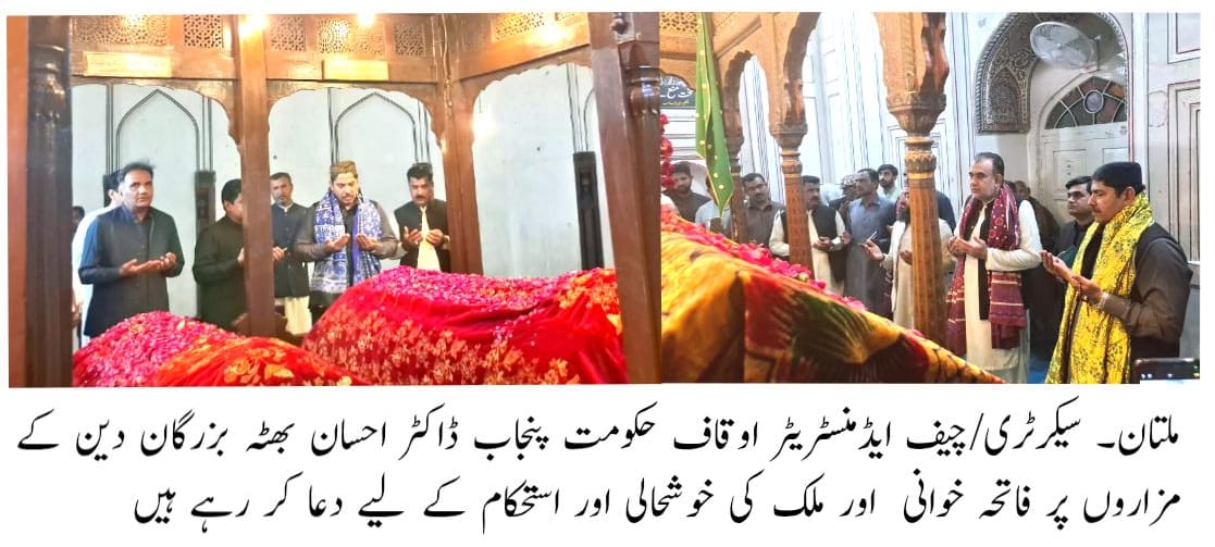 ملتان (ٹی این ایس) سیکرٹری حکومت پنجاب /چیف ایڈمنسٹریٹر اوقاف پنجاب ڈاکٹر احسان بھٹہ نے ملتان میں حضرت شاہ شمس تبریز، حضرت بہاء الدین زکریاؒ، حضرت شاہ رکن عالمؒ اور حضرت موسیٰ پاک شہیدؒ کے مزاروں پر حاضری دی۔ فاتحہ خوانی کی اور ملک کی خوشحالی اور استحکام کے لیے دعا کی۔