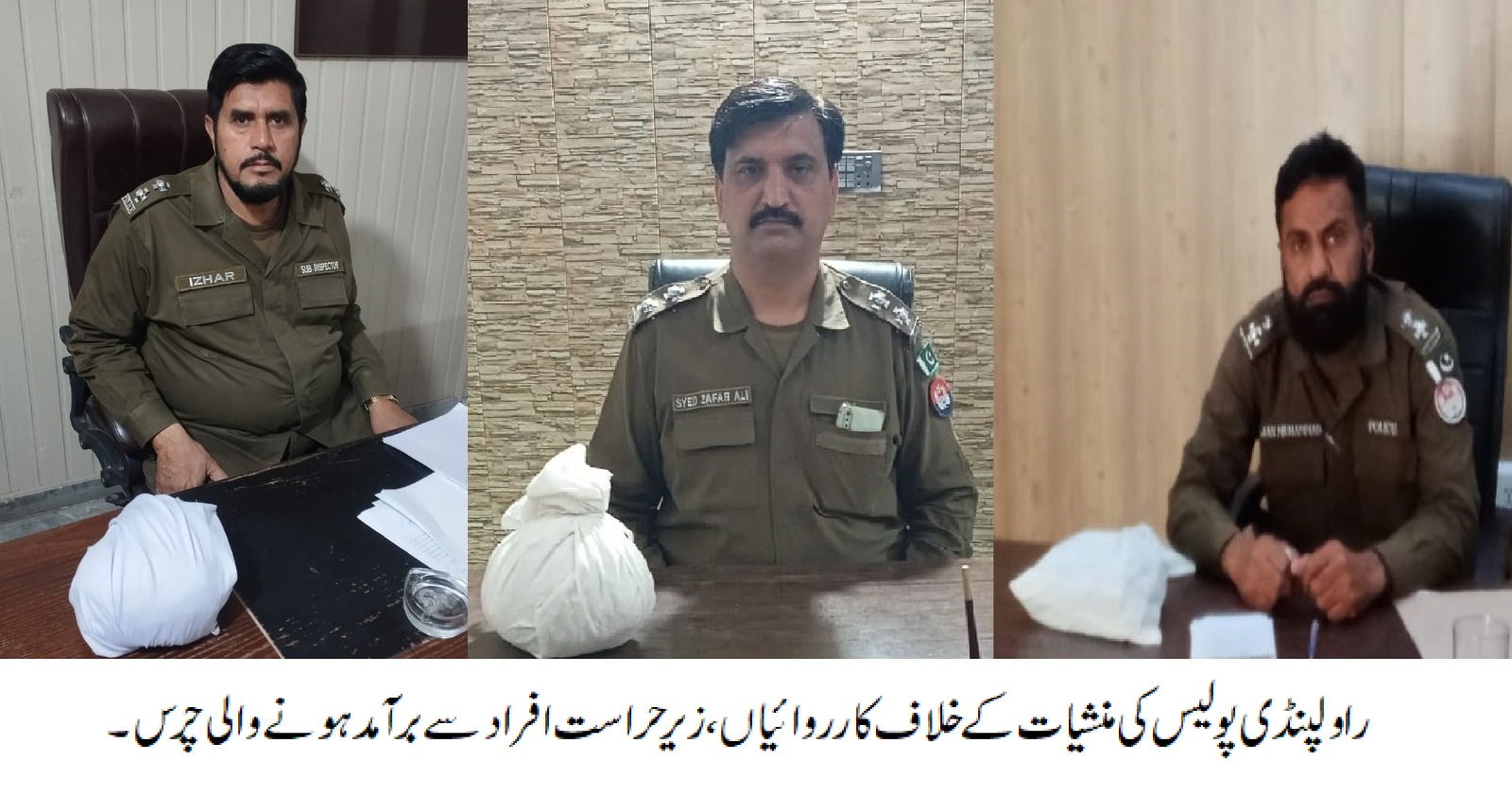 راولپنڈی (ٹی این ایس) سی پی او سید خالد محمود ہمدانی کی ہدایت پر راولپنڈی پولیس کی منشیات کے خلاف کارروائیاں، 5 منشیات سپلائر گرفتار، 8کلو سے زائد چرس برآمد۔ تفصیلات کے مطابق واہ کینٹ پولیس نے ایک فرد کو حراست میں لے کر 2 کلو گرام چرس برآمد کی، نصیر آبادپولیس نے ایک فرد کو حراست میں لے کر 1 کلو 700گرام چرس برآمد کی، کلر سیداں پولیس نے ایک فرد کوحراست میں لے کر 1 کلو 625 گرام چرس برآمد کی، پیرودھائی پولیس نے ایک فرد کو حراست میں لے کر 1کلو 620گرام چرس برآمد کی، دھمیال پولیس نے ایک فرد کو حراست میں لے کر1 کلو 500گرام چرس برآمدکرکے الگ الگ مقدمات درج کرلیے، منشیات کے ناسور کے خاتمے کے لیے تمام اقدامات اٹھائے جارہے ہیں۔