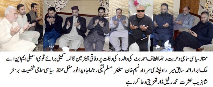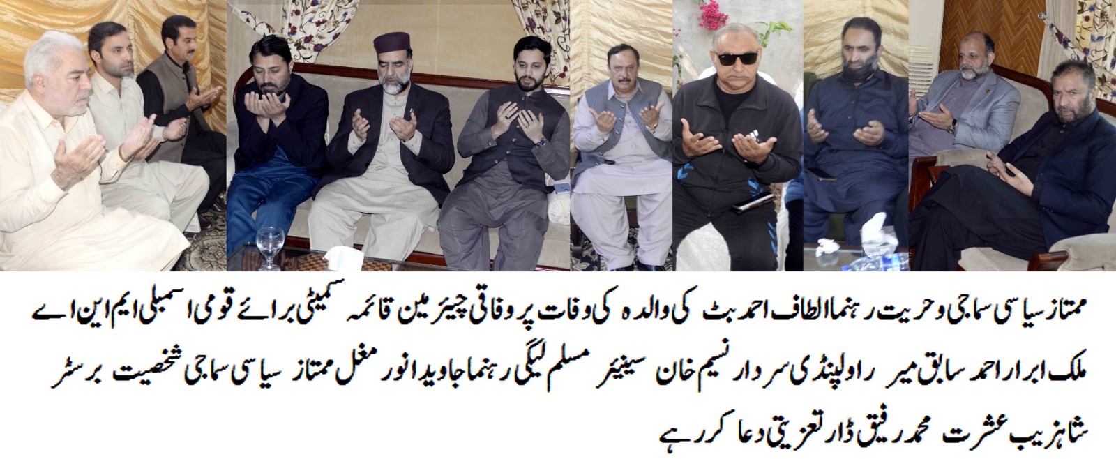 اسلام آباد (ٹی این ایس) ممتاز سیاسی سماجی و حریت رہنما الطاف احمد بٹ کی والدہ کی وفات پر وفاقی چیئرمین قائمہ کمیٹی برائے قومی اسمبلی ایم این اے ملک ابرار احمد سابق میر راولپنڈی سردار نسیم خان سینیئر مسلم لیگی رہنما جاوید انور مغل ممتاز سیاسی سماجی شخصیت برسٹر شاہزیب عشرت محمد رفیق ڈار تعزیتی دعا کر رہے