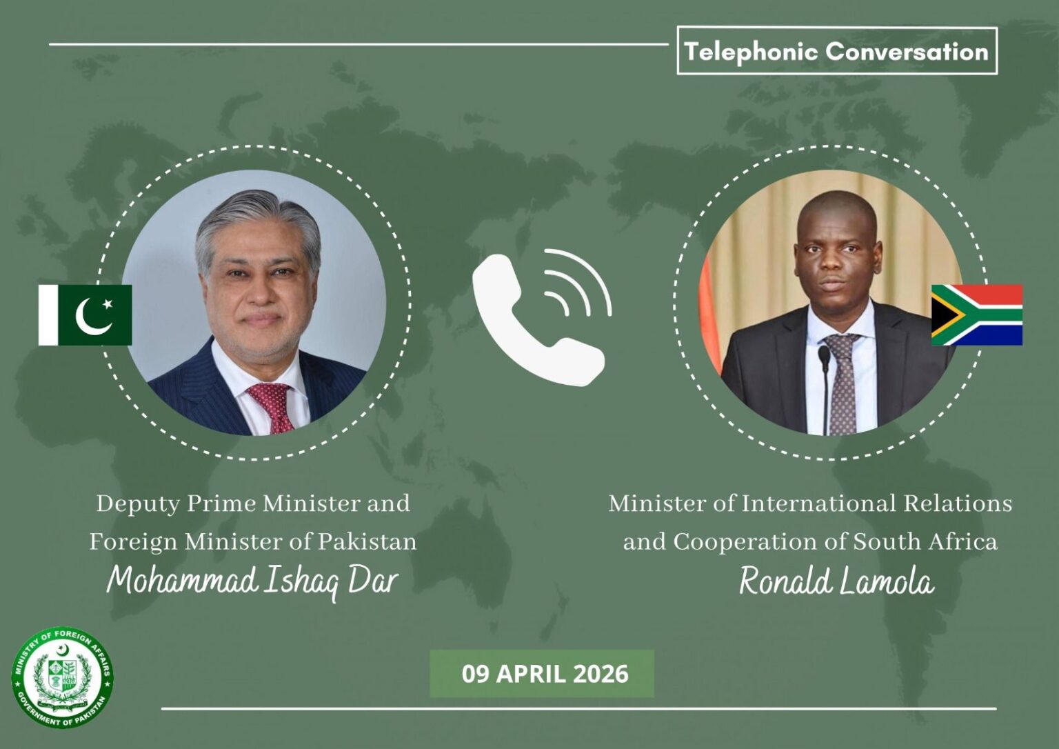 اسلام آباد (ٹی این ایس) نائب وزیرِ اعظم،وزیرِ خارجہ سینیٹر محمد اسحاق ڈار نے آج جنوبی افریقہ کے وزیر برائے بین الاقوامی تعلقات و تعاون، رونالڈ لامولا کے ساتھ ٹیلیفون پر گفتگو کی۔دونوں رہنماں نے مشرقِ وسطی اور وسیع تر خطے میں ہونے والی تازہ پیش رفت پر تبادلہ خیال کیا۔