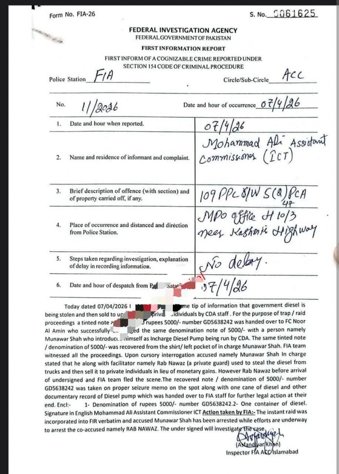 اسلام آباد (ٹی این ایس) : سی ڈی اے کا سرکاری ڈیزل چوری اسکینڈل بے نقاب، ایف آئی اے کی کارروائی،ایک ملزم گرفتار،دوسرا عادی ملزم رب نواز گارڈ فرار اسلام آباد میں فیڈرل انویسٹیگیشن ایجنسی (ایف آئی اے) نے سی ڈی اے کے سرکاری ڈیزل کی چوری اور غیرقانونی فروخت میں ملوث گروہ کے خلاف بڑی کارروائی کرتے ہوئے ایک ملزم کو گرفتار کر لیا جبکہ اس کا ساتھی فرار ہو گیا۔تفصیلات کے مطابق ایف آئی اے نے مقدمہ نمبر 11/2026 مورخہ 07 اپریل 2026 درج کیا، جس کی اطلاع اسسٹنٹ کمشنر اسلام آباد محمد علی کی جانب سے دی گئی۔ رپورٹ کے مطابق ایف آئی اے کو خفیہ اطلاع ملی کہ سرکاری ڈیزل چوری کرکے نجی افراد کو فروخت کیا جا رہا ہے۔اطلاع ملنے پر ایف آئی اے ٹیم نے اسلام آباد کے علاقے ایم پی او آفس H-10/3، کشمیر ہائی وے کے قریب چھاپہ مار کارروائی کی۔ کارروائی کے دوران ٹریپ کے طور پر 5000 روپے کا نشاندہی شدہ نوٹ ایف سی اہلکار کے ذریعے ملزم کو دیا گیا۔ ملزم نے خود کو سی ڈی اے کے زیر انتظام ڈیزل پمپ کا انچارج ظاہر کیا۔ چھاپے کے دوران مذکورہ 5000 روپے کا نوٹ ملزم منور شاہ کی جیب سے برآمد کر لیا گیا، جبکہ ایک ڈیزل سے بھرا کنٹینر اور ریکارڈ بھی قبضے میں ل