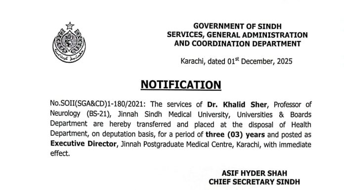 کراچی (ٹی این ایس) کراچی محکمہ سروسز، جنرل ایڈمنسٹریشن اینڈ کوآرڈینیشن ڈیپارٹمنٹ, حکومتِ سندھ کی جانب سے اہم نوٹیفکیشن جاری۔ پروفیسر ڈاکٹر خالد شیر کو جناح پوسٹ گریجویٹ میڈیکل سینٹر کے ایگزیکٹو ڈائریکٹر کے طور پر تین برس کے لیے تعینات کر دیا گیا ہے. ڈاکٹر خالد شیر، جو نیورولوجی کے سینئر پروفیسر ہیں، انہیں جے ایس ایم یو...